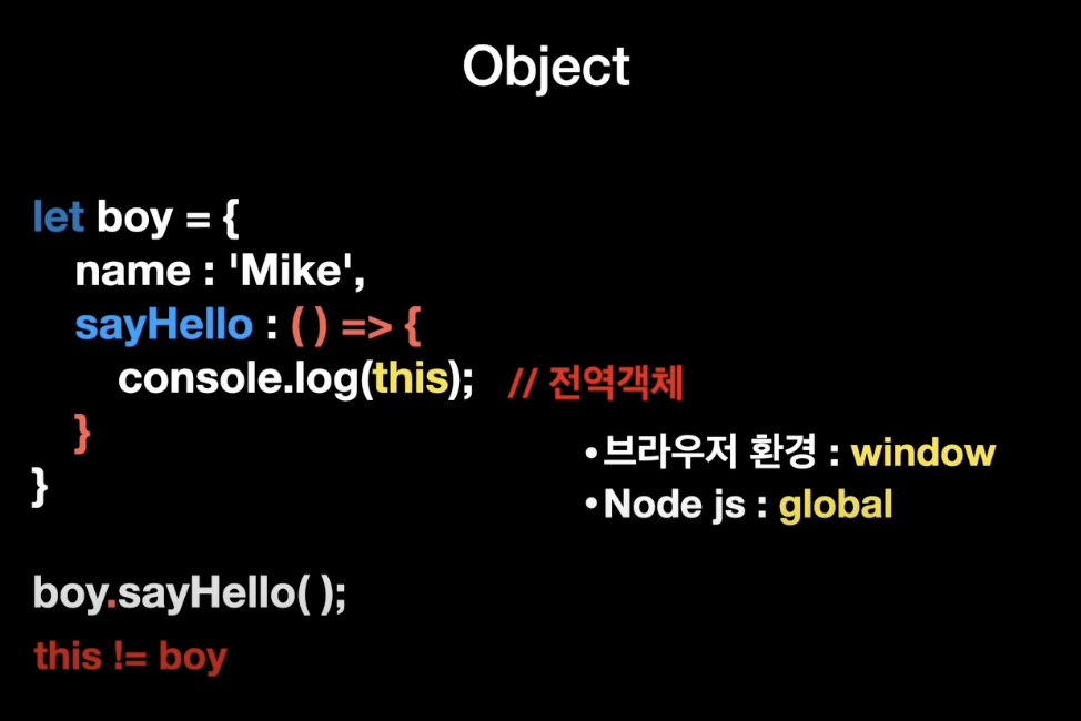 따라서, 객체의 메소드를 작성할 땐 화살표함수로 작성하지 않는것이 좋다.