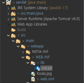 3. 프로젝트 >> src/main/webapp >> WEB-INF >> lib >> cos.jar 파일 붙여넣기