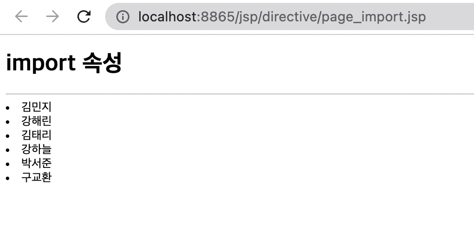page Directive의 import 속성에는 JSP 문서에서 사용할 클래스 또는 인터페이스를 속성값으로 설정한다. import 속성을 사용하는 이유는 클래스 또는 인터페이스의 패키지를 사용하여 명확하게 표현하기 위해서이다.