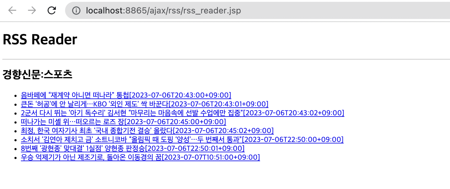 RSS 서비스를 제공하는 웹프로그램을 AJAX 기능으로 요청하여 실행결과를 응답받아 클라이언트에게 전달하여 응답하는 JSP 문서를 만들어보자.