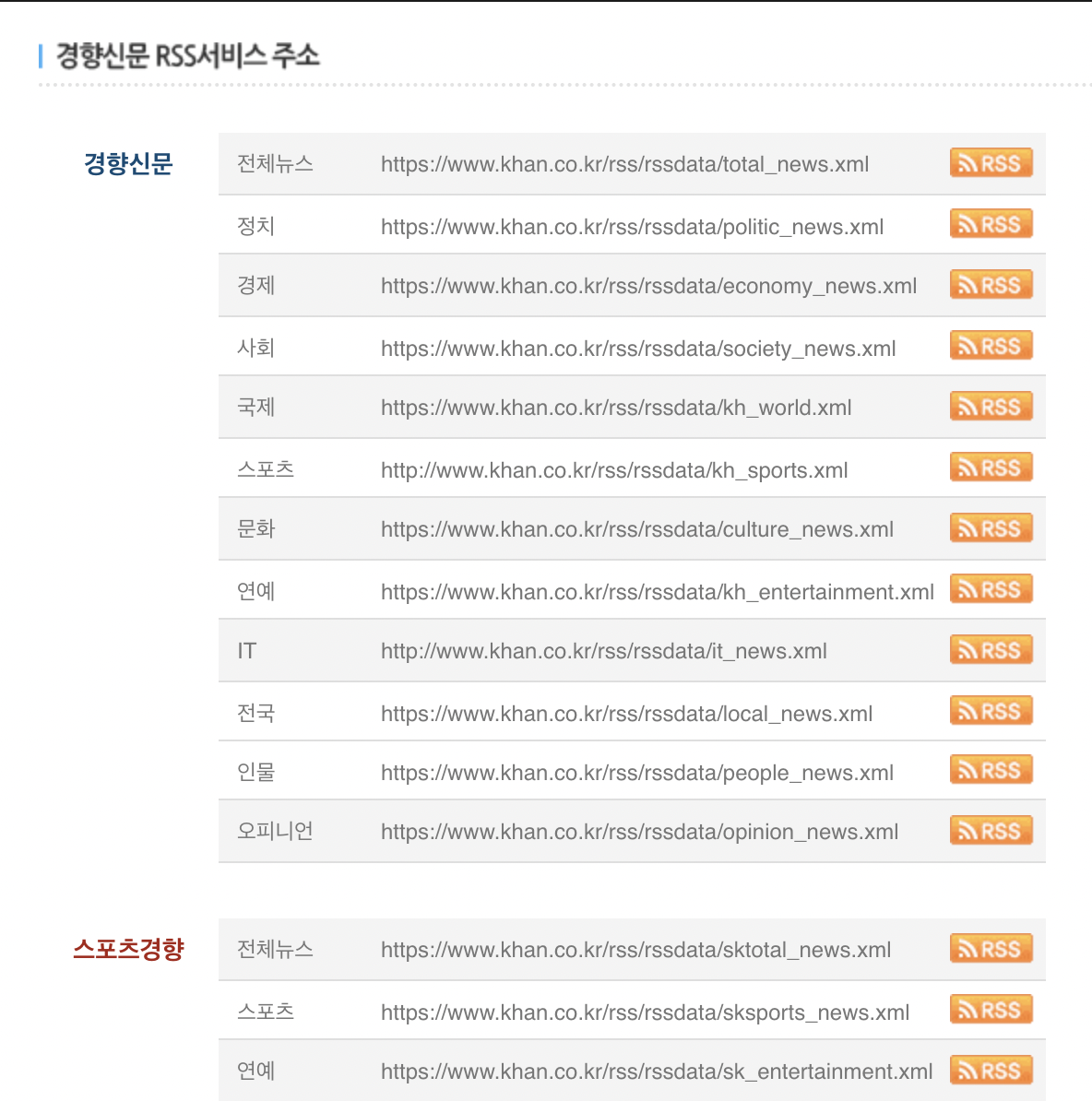 예시로 경향신문의 스포츠 부문을 이용했다 (https://www.khan.co.kr/rss/rssdata/kh_sports.xml)