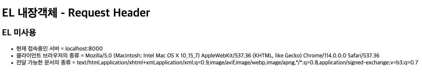 EL 표현식에서 header 내장객체 또는 headerValues 내장객체를 사용하여 리퀘스트 메세지의 머릿부에 저장된 값을 제공받아 출력 처리가 가능하다.