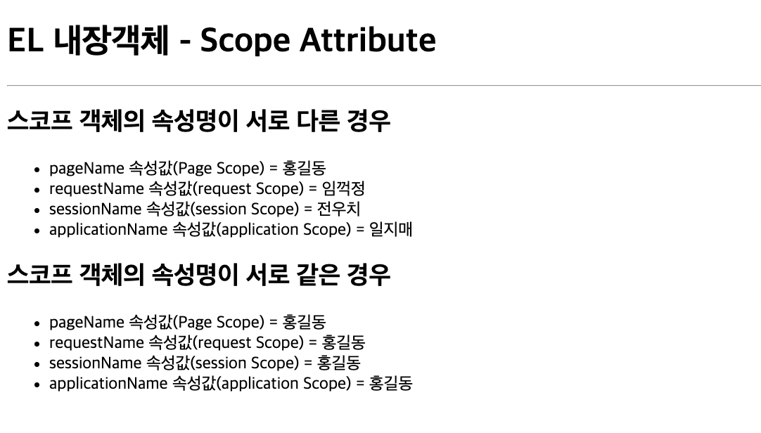 Scope 객체에 동일한 이름의 속성명을 사용하여 속성값을 저장한 경우 EL 내장객체를 사용하여 스코프 객체를 구분하여 속성값을 제공받아 출력 처리할 수 있다.