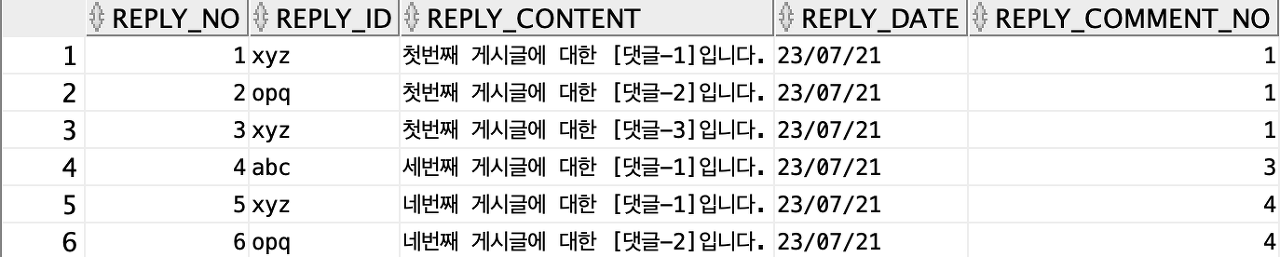 , reply_no, comment_id, comment_content, reply_date, reply_comment_no, reply_user_id