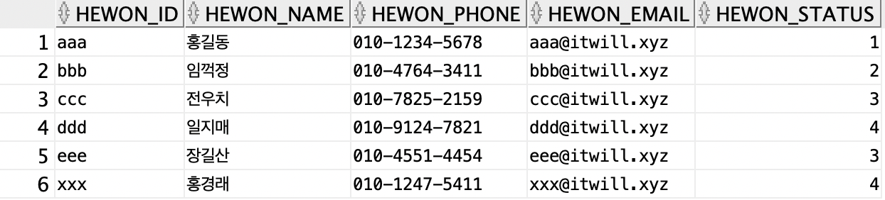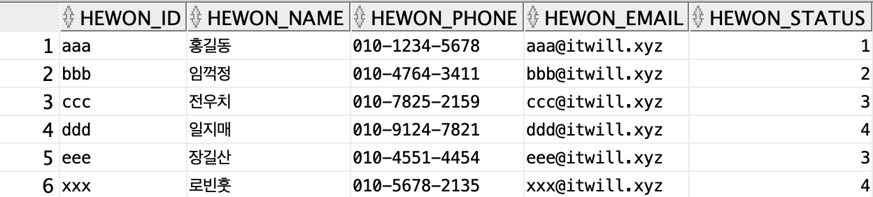 select hewon_id, hewon_name, hewon_phone, hewon_email, hewon_status from myhewon