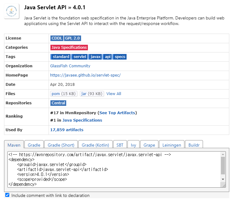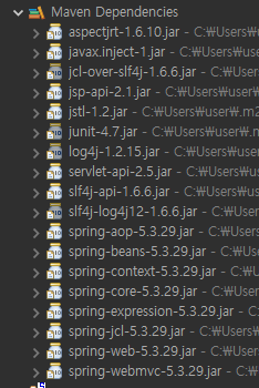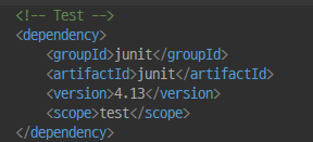 dependency 엘리먼트 : 라이브러리 파일을 제공받아 프로젝트에 빌드 처리하기 위한 엘리먼트