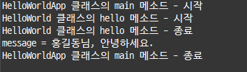 System.out.println("HelloWorld 클래스의 hello 메소드 - 종료");