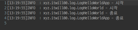 logger.info("시작");//info 레벨의 이벤트를 발생시킴