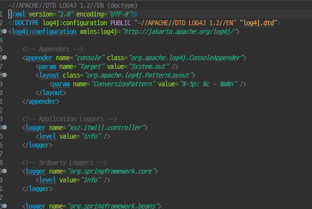 <!-- log4j.xml : 로그 구현체의 실행을 위한 정보를 제공하는 환경설정파일 -->