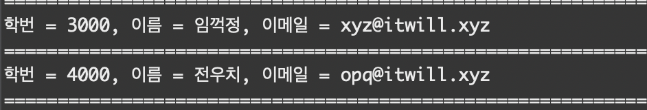 System.out.println("### Student 클래스의 매개변수(학번, 이름, 이메일)가 선언된 생성자 호출 ###");