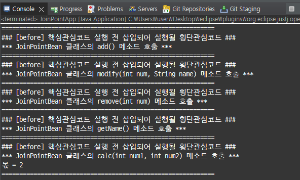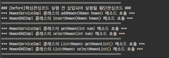 System.out.println("### [before] 핵심관심코드 실행 전 삽입되어 실행될 횡단관심코드 ###");