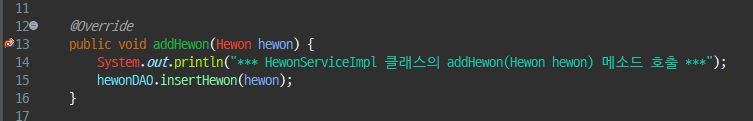 //인터페이스를 상속받아 오버라이드 선언된 메소드(Pointcut)에서 핵심관심코드에 횡단관심코드가