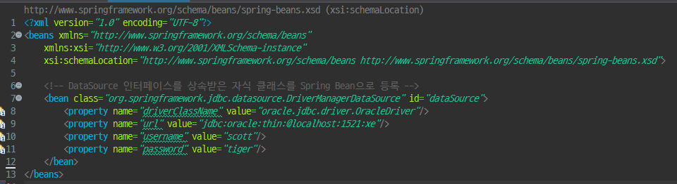 <!-- => JdbcTemplate 클래스의 dataSource 필드에 DataSource 인터페이스를 상속받은 자식클래스의