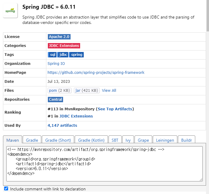 https://mvnrepository.com/artifact/org.springframework/spring-jdbc/6.0.11
