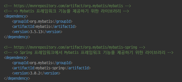 ojdbc, spring-jdbc(spring-tx)는 이미 빌드처리 되어 있기 때문에 mybatis, mybatis-spring을 빌드처리 해줄 것이다.