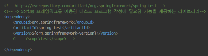 - junit 라이브러리와 spring-test 라이브러리의 scope 속성값을 주석 처리한 후 테스트 프로그램 관련 클래스를 작성한다.