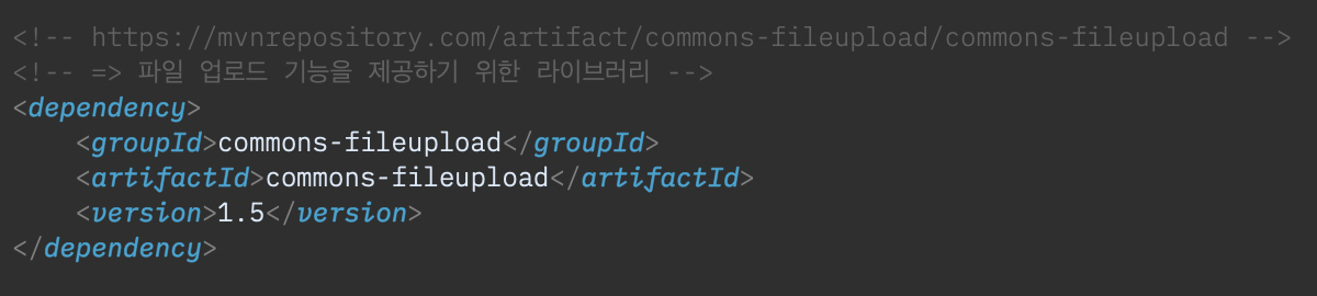 1. commons-fileupload 라이브러리를 프로젝트에 빌드 처리한다. - 메이븐 사용 : pom.xml