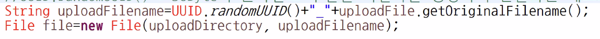 UUID 클래스를 이용해 전달파일을 서버 디렉토리에 저장될 업로드 파일 정보가 저장된 File 객체를 생성할 때, 서버 디렉토리에 저장된 파일이름은 중복되지 않는 이름으로 사용될 수 있도록 변경 처리 해줄 것이다.