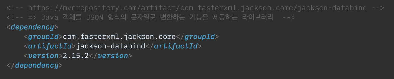 -> jackson-databind 라이브러리를 프로젝트에 빌드 처리하면 요청 처리 메소드에 의해 반환되는 Java 객체를 JSON 형식의 문자열로 자동 변환하여 응답처리할 수 있다. - 메이븐 : pom.xml