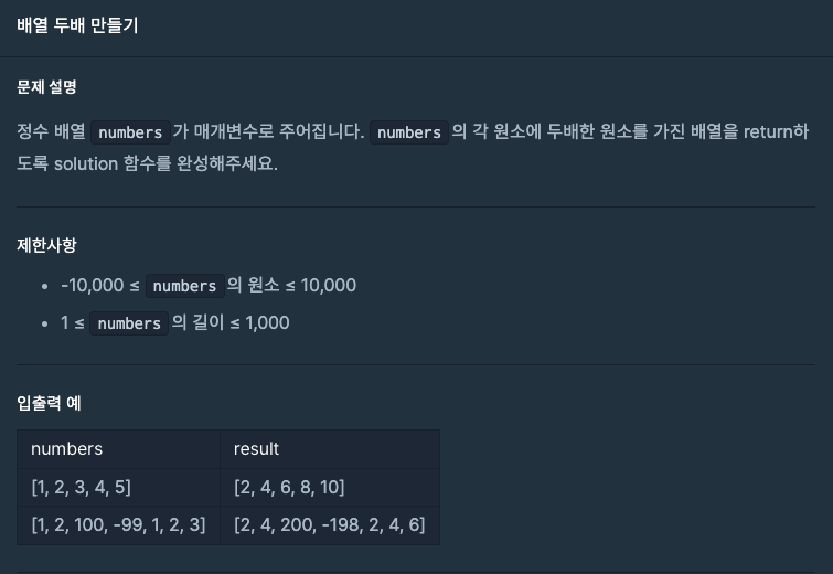 그 후 반복문으로 numbers 배열의 값에 2를 곱한 값을 answer 배열에 넣어준 후 return