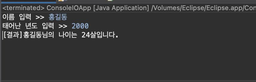 System.out.println("[결과]" + name + "님의 나이는 " + age + "살입니다.");