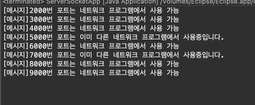 System.out.println("[메시지]" + i + "번 포트는 이미 다른 네트워크 프로그램에서 사용중입니다.");
