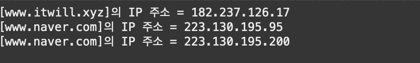 System.out.println("[www.itwill.xyz]의 IP 주소 = " + itwill.getHostAddress());