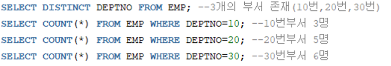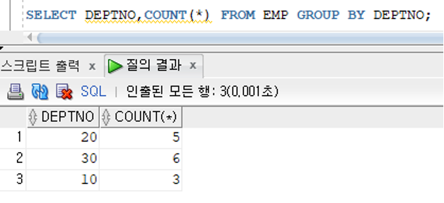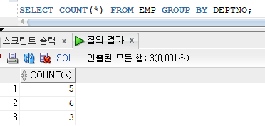 EMP 테이블에 저장된 모든 사원을 부서로 구분하여 인원수 검색
