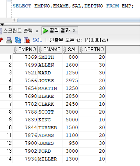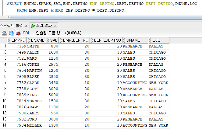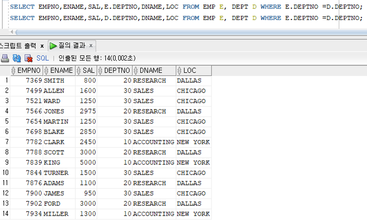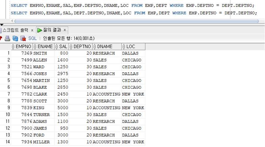 - 두개이상의 테이블에 같은 이름의 컬럼이 존재하는 경우 반드시 [테이블명.컬럼명] 형식으로 구분하여 표현