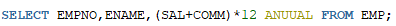 EMP 테이블에 저장된 모든 사원의 사원번호,사원이름,연봉((급여+성과급)*12) 검색