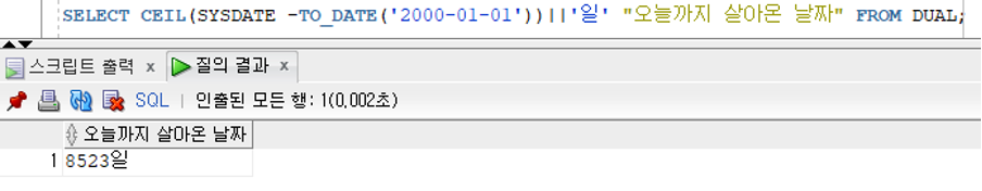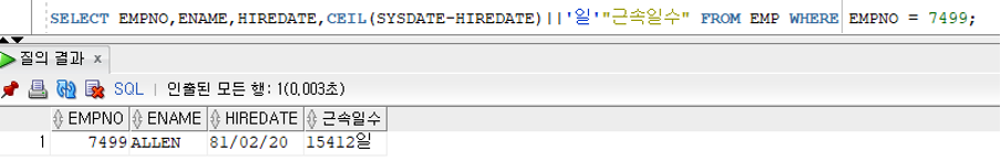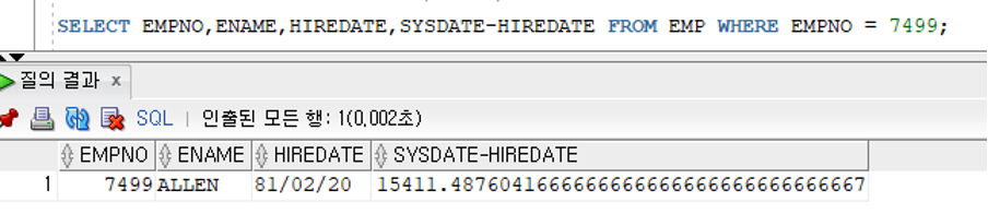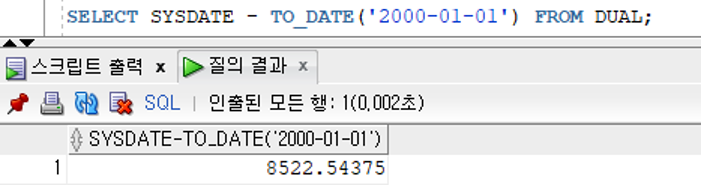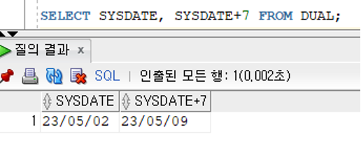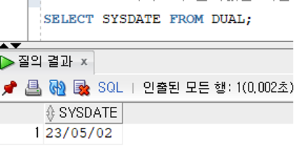 - SYSDATE 키워드의 검색값은 기본적으로 [RR/MM/DD] 패턴으로 검색되지만 내부적으로는 날짜와 시간을 제공