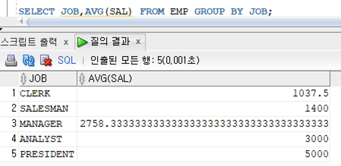 - 컬럼값이 같은 경우 같은 그룹으로 처리하여 그룹함수의 결과값 반환