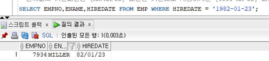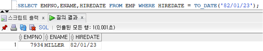 >> 현재 접속된 사용자 환경(세션)의 날짜와 시간의 기본패턴이 [RR/MM/DD]인 경우에만 검색 가능하다