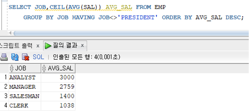 EMP 테이블에서 업무가 PRESIDENT인 사원을 제외한 모든 사원의 업무별 평균 급여를 평균급여로 내림차순 정렬하여 검색