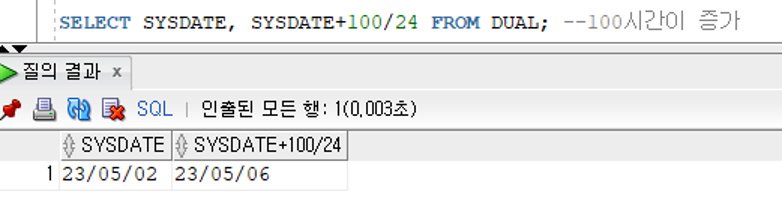SELECT SYSDATE, SYSDATE-100/24 FROM DUAL; --100시간이 감소