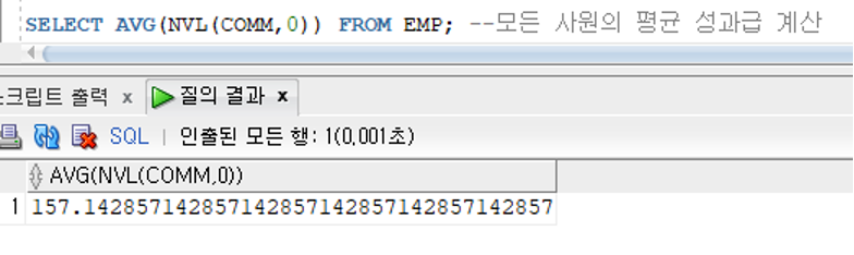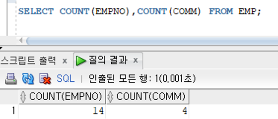 그룹함수는 NULL을 값으로 처리하지 않고 결과값 반환