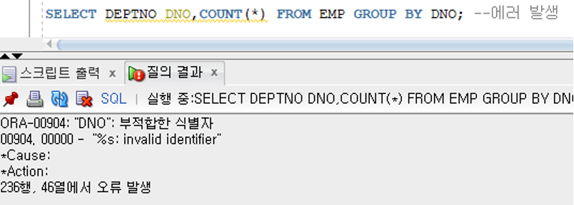 GROUP BY의 표현식으로 컬럼의 별칭 사용 불가능