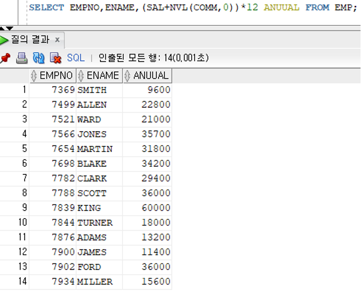 >> 성과급이 NULL인 경우 연산이 불가능하므로 NULL 결과값 검색 – 검색 오류