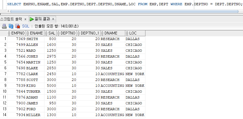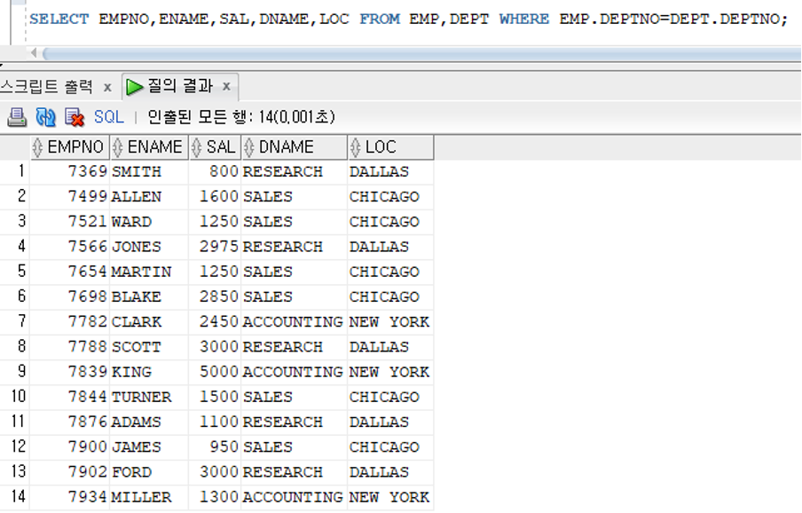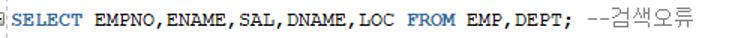 -결합조건 : EMP 테이블의 부서번호(DEPTNO)와 DEPT 테이블의 부서번호(DEPTNO)가 같은 행만 결합