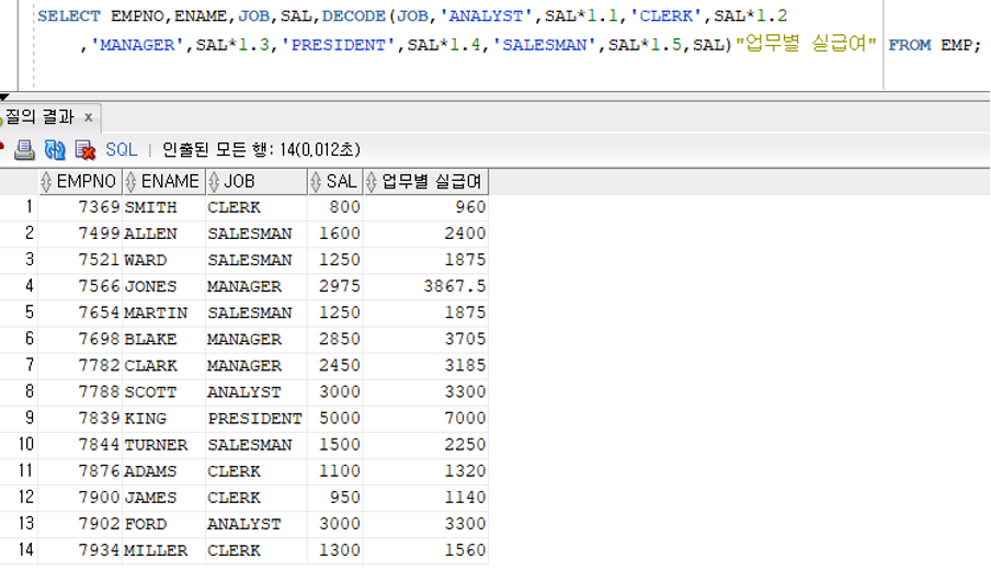 -> ANALYST : 급여*1.1, CLERK : 급여*1.2, MANAGER : 급여*1.3, PRESIDENT : 급여*1.4, SALESMAN : 급여*1.5
