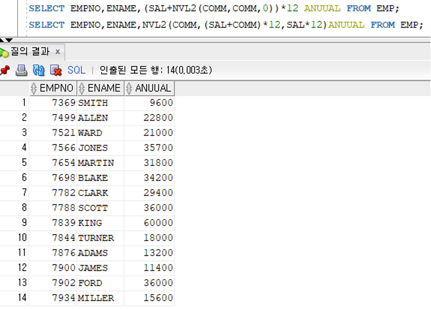 - 비교값이 모두 다른 경우 기본값으로 변환하여 반환하고, 기본값이 생략된 경우 NULL 반환