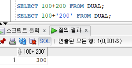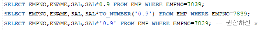 비교 컬럼의 자료형이 숫자형인 경우 비교값이 문자값이면 자동으로 숫자값으로 변환되어 비교되어 자동 형변환 되기 때문에 굳이 TO_NUMBER를 사용할 필요가 없다.