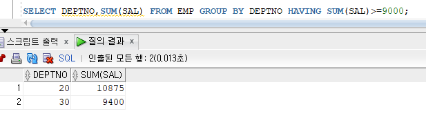 : GROUP BY에 의해 그룹화된 검색결과에서 그룹조건이 참(TRUE)인 그룹만 검색하는 기능 제공 >> 그룹에 대한 조건식