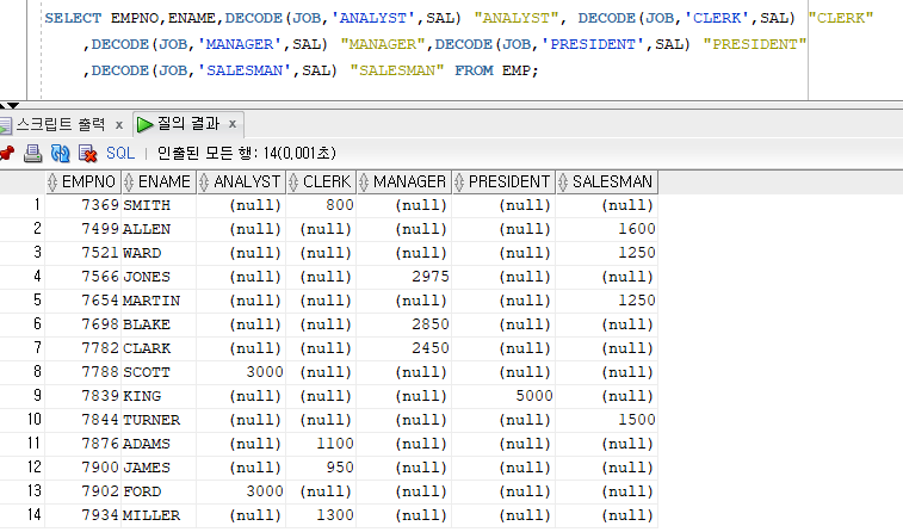 EMP 테이블에 저장된 모든 사원의 사원번호,사원이름,업무별 급여 검색 - 해당 업무가 아닌 경우에는 NULL 검색