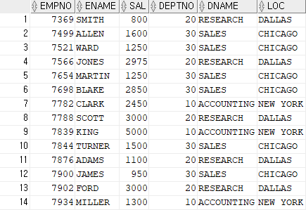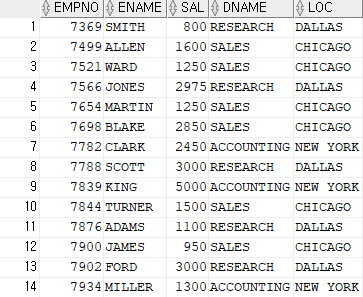 SELECT EMPNO,ENAME,SAL,DNAME,LOC FROM EMP JOIN DEPT ON EMP.DEPTNO=DEPT.DEPTNO;