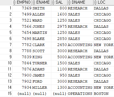 SELECT EMPNO,ENAME,SAL,DNAME,LOC FROM EMP,DEPT WHERE EMP.DEPTNO (+)= DEPT.DEPTNO;