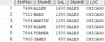 SELECT EMPNO,ENAME,SAL,DEPTNO,DNAME,LOC FROM EMP NATURAL JOIN DEPT;