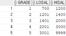 SELECT GRADE,LOSAL,HISAL FROM SALGRADE;