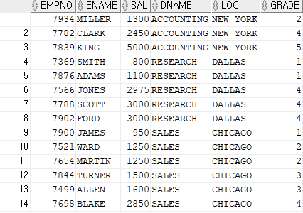 SELECT EMPNO,ENAME,SAL,DNAME,LOC,GRADE FROM EMP JOIN DEPT ON EMP.DEPTNO=DEPT.DEPTNO