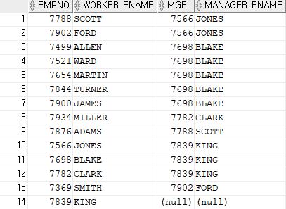 FROM EMP WORKER, EMP MANAGER WHERE WORKER.MGR=MANAGER.EMPNO(+);